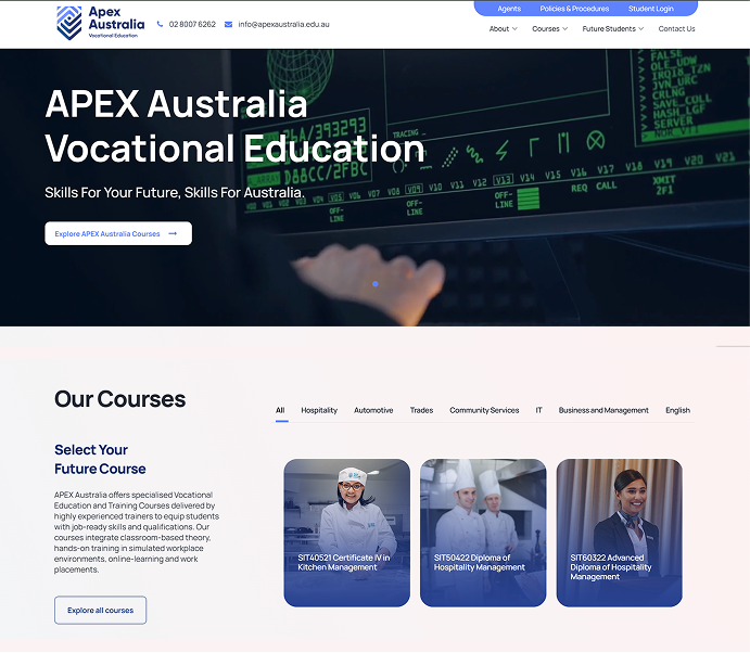 APEX Australia’s VET learning platform required more than a visual refresh — it needed a functional transformation. Our goal was to evolve the site into a modern, intuitive digital environment that supports vocational learners, trainers, and partners. We aimed to simplify the user journey, unify the design language, and create a platform that reflects APEX’s commitment to accessible, future-focused education.