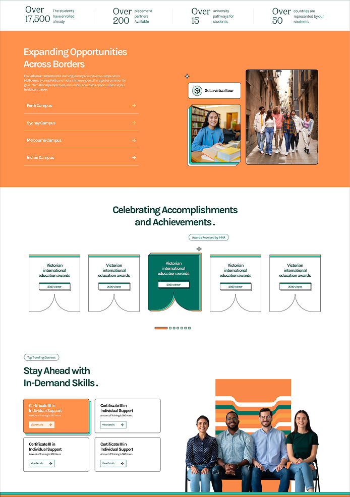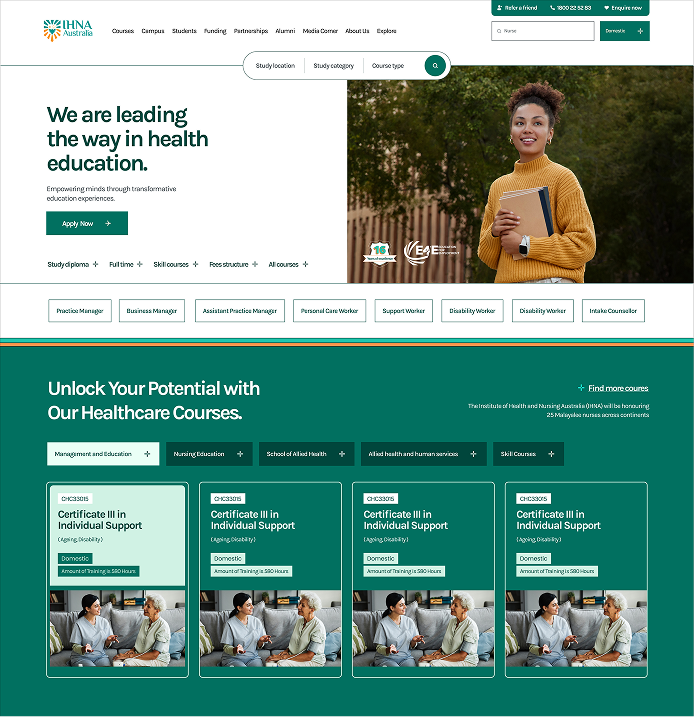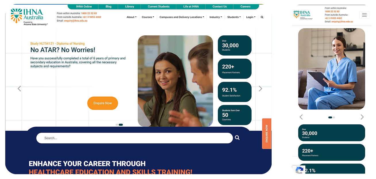 The Institute of Health & Nursing Australia (IHNA) website needed more than a facelift, it required a fundamental shift. Metaveo's goal was clear: transform a cluttered, aging site into a future-ready digital campus. We envisioned a platform that would streamline the user journey, reflect a modern “education for the future” ethos, and support IHNA’s 30,000+ global students. In short, turn confusion into clarity and make finding information effortless.